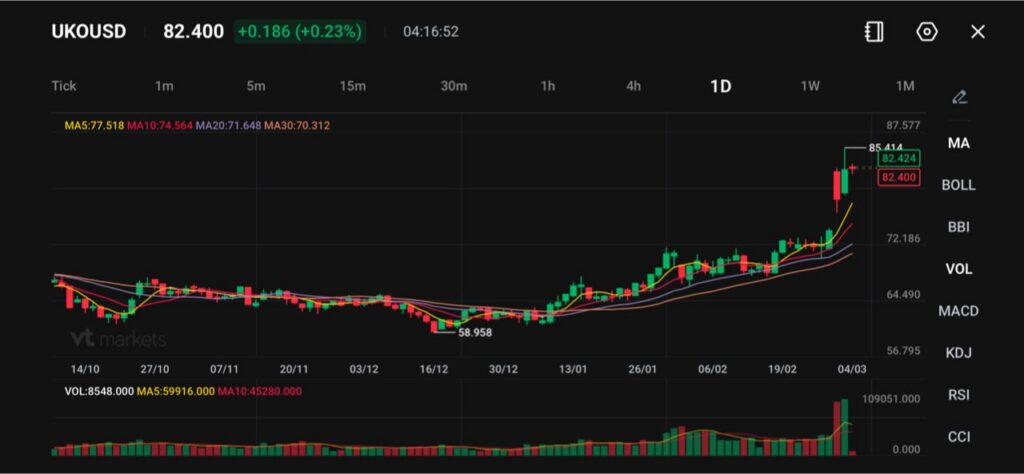 قیمت نفت همچنان بالاست. UKOUSD (نفت برنت) نزدیک ۸۲.۴۰ دلار معامله میشود و بعد از جهش قوی از کف دسامبر حوالی ۵۸.۹۶ دلار نزدیک سقفهای اخیر مانده است. «تحلیل فنی» یعنی بررسی نمودار قیمت و الگوها برای حدسزدن حرکت بعدی. ساختار کلی در نمودار روزانه روند صعودی روشنی را نشان میدهد؛ یعنی از ابتدای سال، سقفها و کفهای بالاتری ثبت شده است.