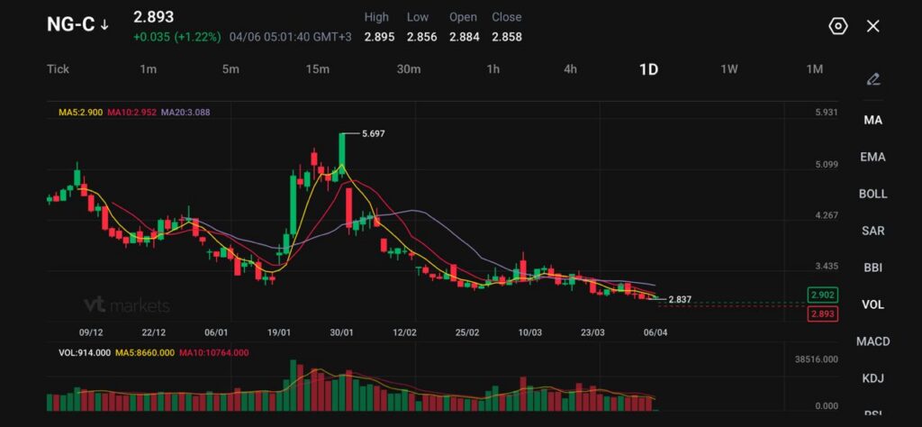 يحاول الغاز الطبيعي الأميركي الارتداد، لكن الاتجاه العام ما زال ضعيفاً. يتداول NG-C عند 2.893 مرتفعاً 0.035 أو 1.22%، بينما تتحرك الأسعار قرب 2.84 إلى 2.89 دولار لكل MMBtu. ورغم هذا الارتفاع المحدود، ما تزال العقود الآجلة قرب أضعف المستويات منذ أغسطس 2025.