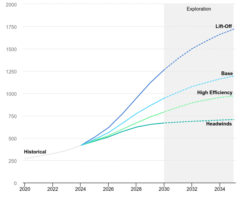 - انطلاقة (نمو متسارع): يُتوقع أن يصل الطلب إلى نحو 1,750 تيراواط/ساعة بحلول 2035 (وهي وحدة لقياس كمية الكهرباء المستهلكة).