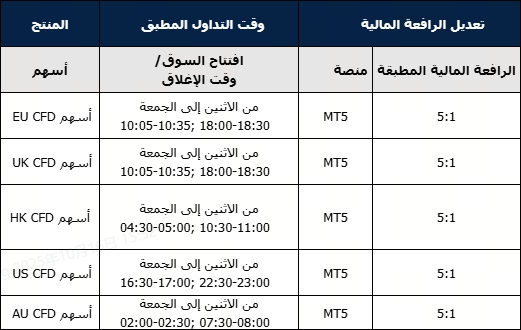 1. تظل جميع مواصفات عقود الفروقات للأسهم كما هي باستثناء الرافعة المالية خلال الفترة المذكورة.
