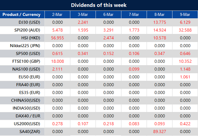 Please note that the dividends of the following products will be adjusted accordingly. Index dividends will be executed separately through a balance statement directly to your trading account, and the comment will be in the following format “Div & Product Name & Net Volume ”.
