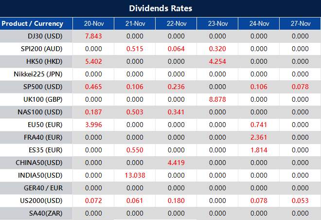 Please note that the dividends of the following products will be adjusted accordingly. Index dividends will be executed separately through a balance statement directly to your trading account, and the comment will be in the following format “Div & Product Name & Net Volume ”.