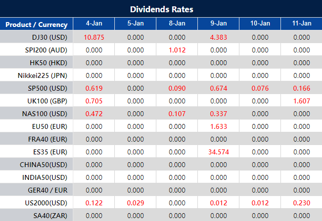 Please note that the dividends of the following products will be adjusted accordingly. Index dividends will be executed separately through a balance statement directly to your trading account, and the comment will be in the following format “Div & Product Name & Net Volume ”.