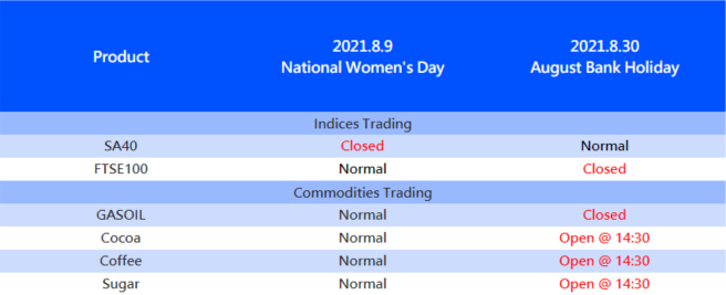 Please note that adjustment on following products due to National Women’s Day and August Bank Holiday.
