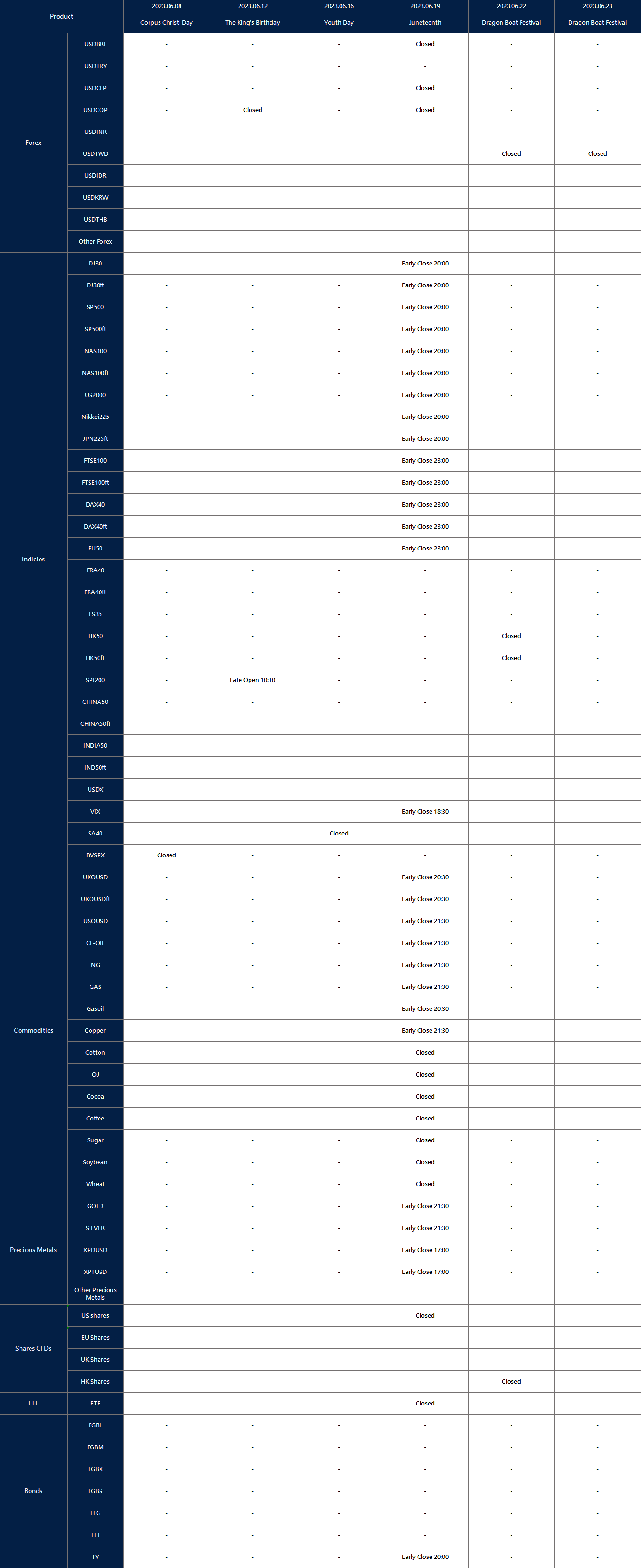 Please note that the following instruments’ trading hours will be affected by the upcoming holidays.